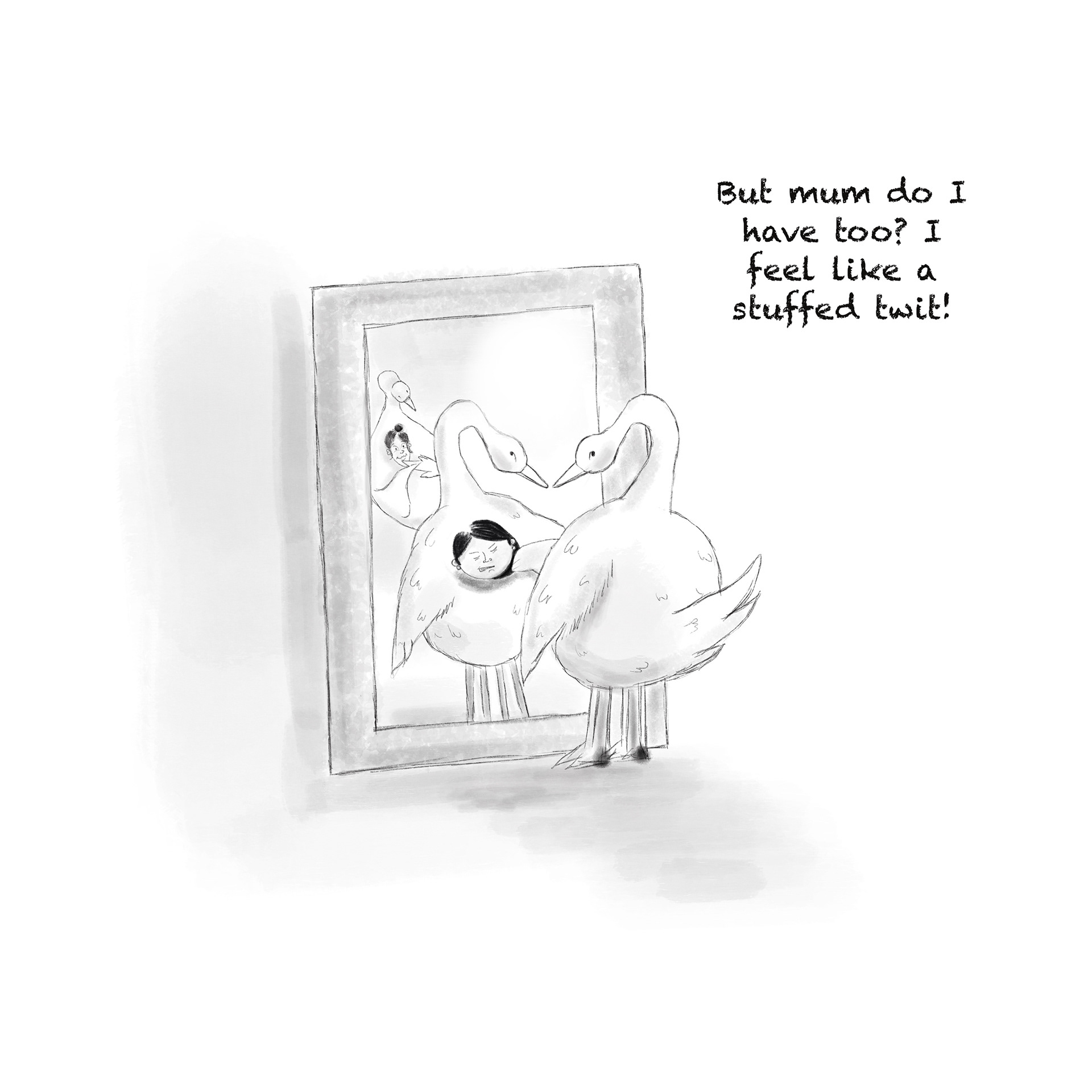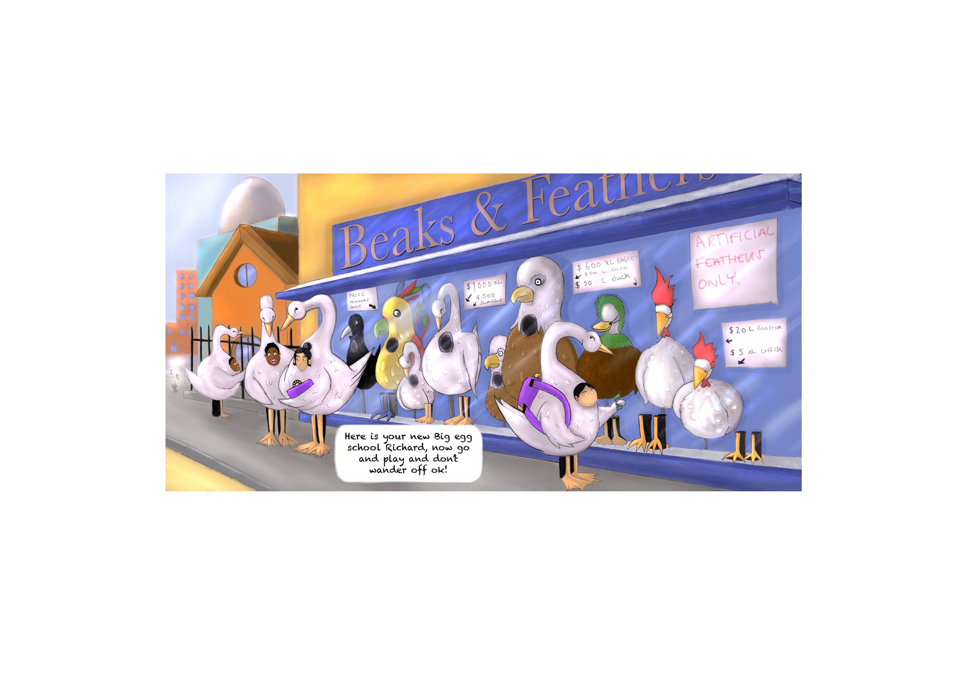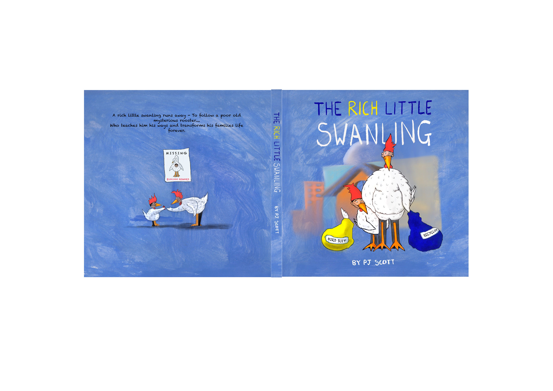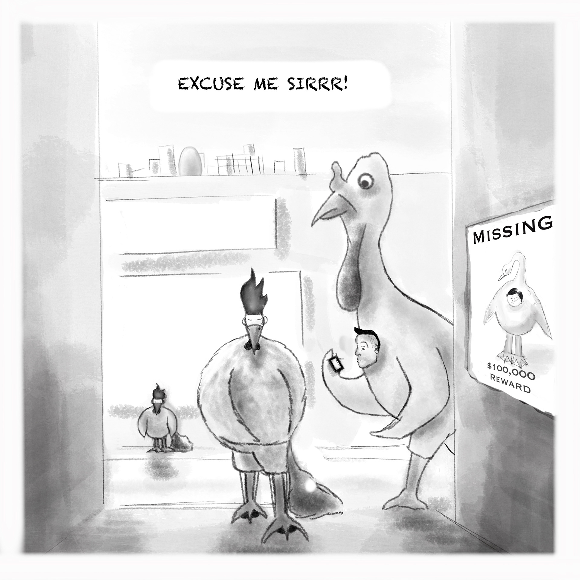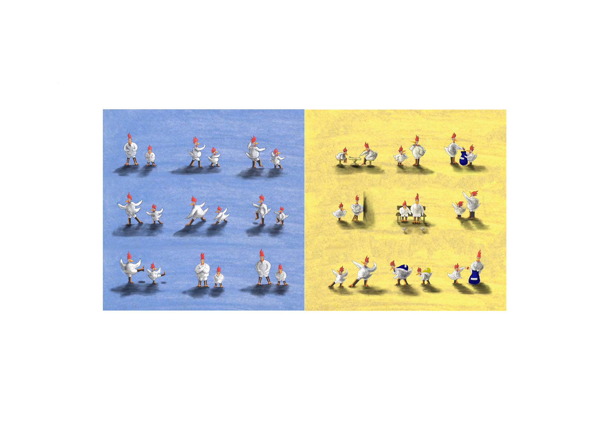 These children's book illustrations show a rich little swanling who wants to befriend a poor man dressed in an old chicken costume. The story is set in a city called The Big Egg, where the rich dress as swans and the poor can barely afford to clothe themselves like chickens. The story grew out of a sculpture project I created at college, inspired by my research on inequality in Hong Kong and the men who live in caged bunk beds there.